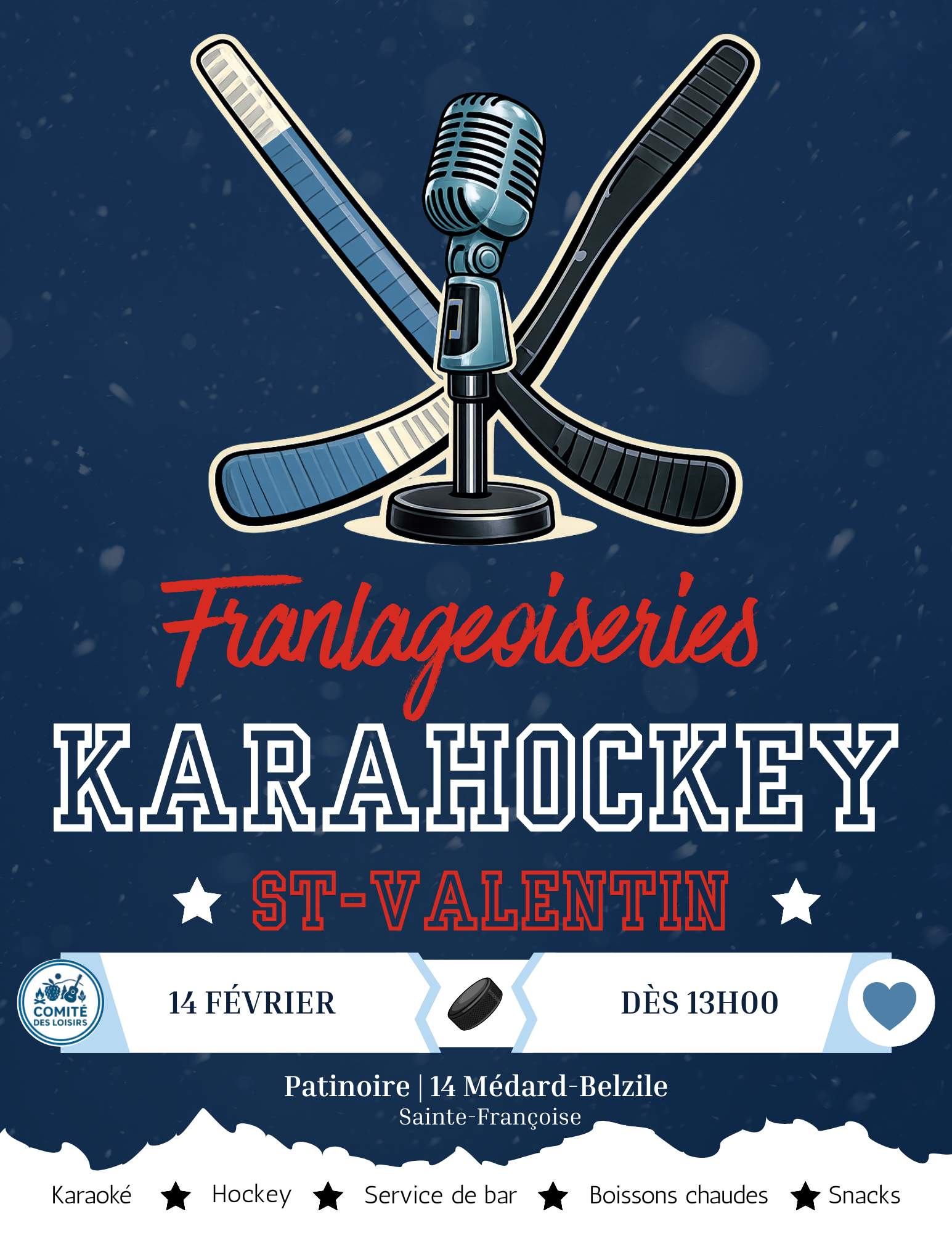 Karaoké ( pour chanter la pomme à votre moitié ), Hockey et patin libre, Musique, Boissons chaudes réconfortantes, Service de bar et snacks