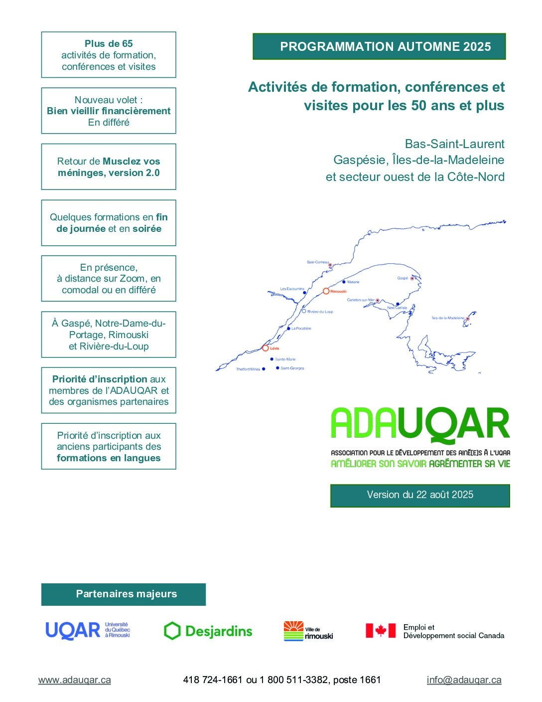 Cette fois encore, les bénévoles de l’Association pour le développement des ainés et ainées à l’UQAR (ADAUQAR) se sont surpassés en concoctant une programmation comportant plus de 65 formations, conférences et visites, accessibles, diversifiées, de qualité et plaisantes à souhait à l’automne 2025.