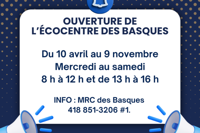 Ouvert du 10 avril au 9 novembre 2024, du mercredi au samedi entre 8 h et 12 h et 13 h à 16 h, l'écocentre de la MRC des Basques est situé au 2, route à Cœur à Notre-Dame-des-Neiges. Pour plus d’information, visitez le www.mrcdesbasques.com ou contactez la MRC des Basques au 418 851-3206 #1.