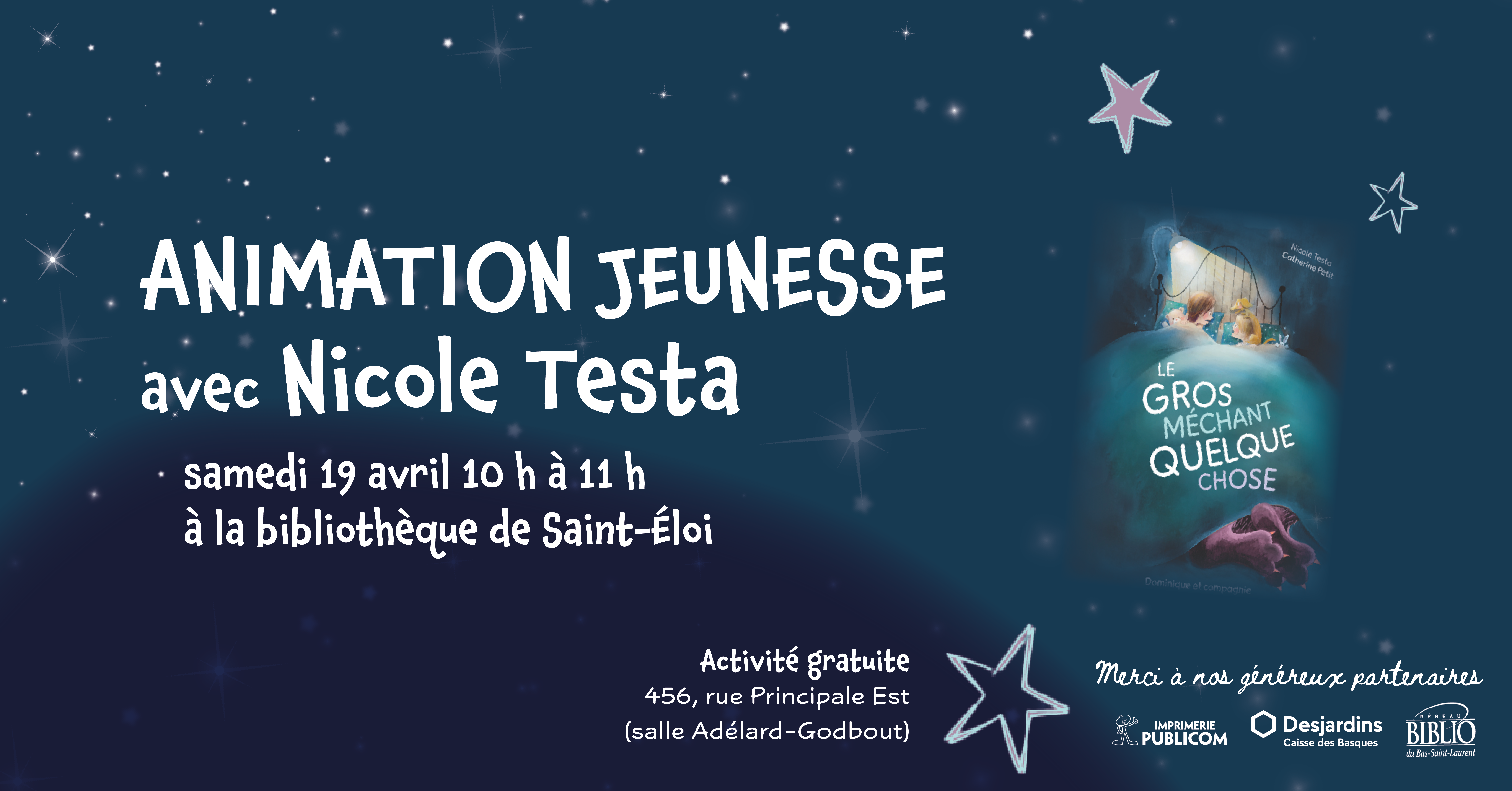 Lieu Bibliothèque de Saint-Éloi -- Salle Adélard-Godebout 456, rue Principale Est