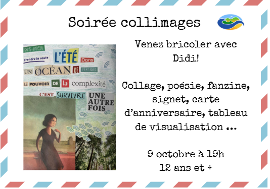 Soirée collimages (12 ans et plus). Collage, poétique, fanzine, signet, carte d’anniversaire, tableau de visualisation … Le matériel sera fourni, mais vous pouvez apporter le vôtre.