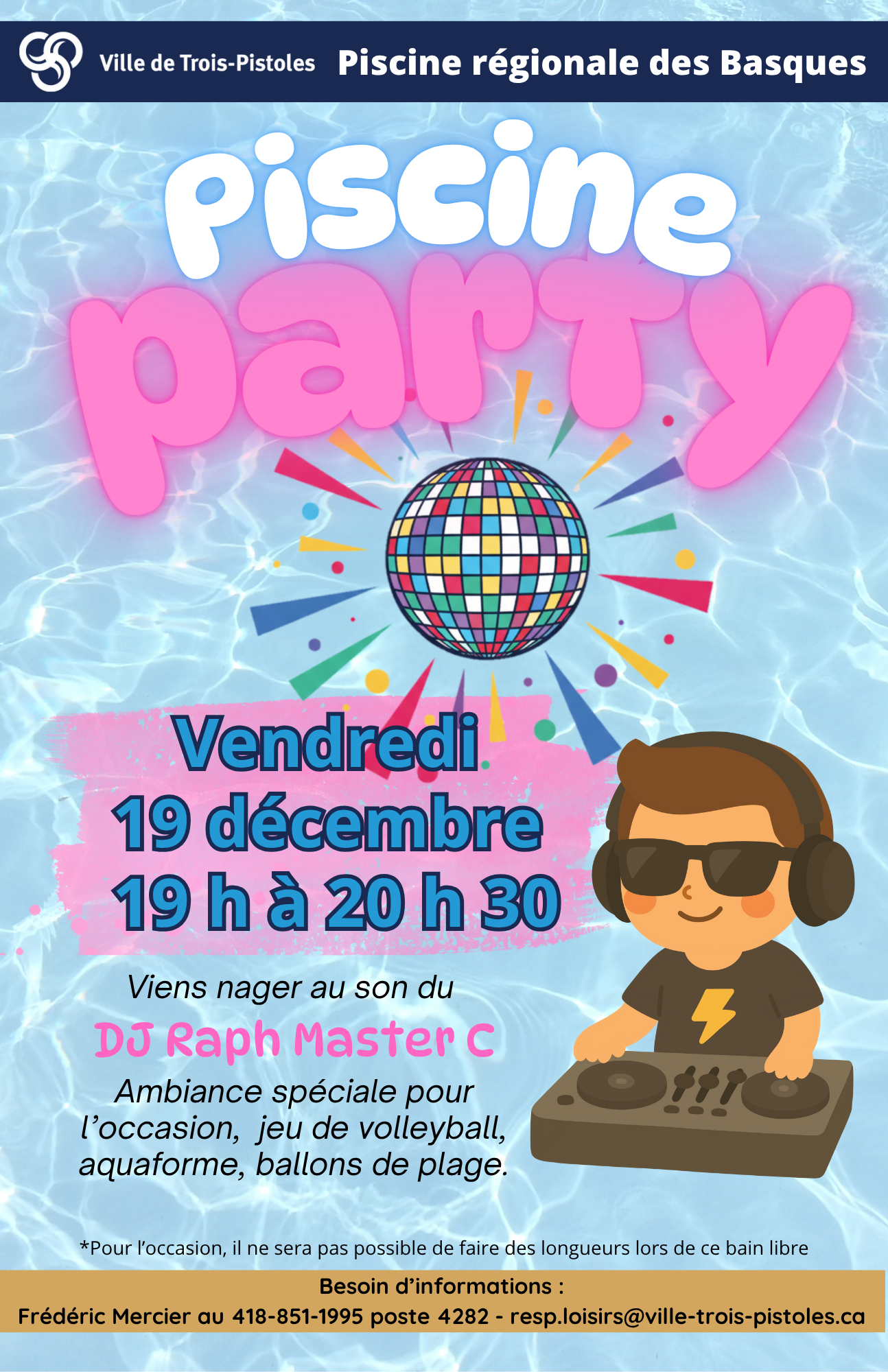 Viens te baigner et danser au son du DJ Rahph Master C. Ambiance festive, ballons de plage, filet de volleyball et autres. Amène ta bonne humeur et viens débuter le temps des fêtes avec nous