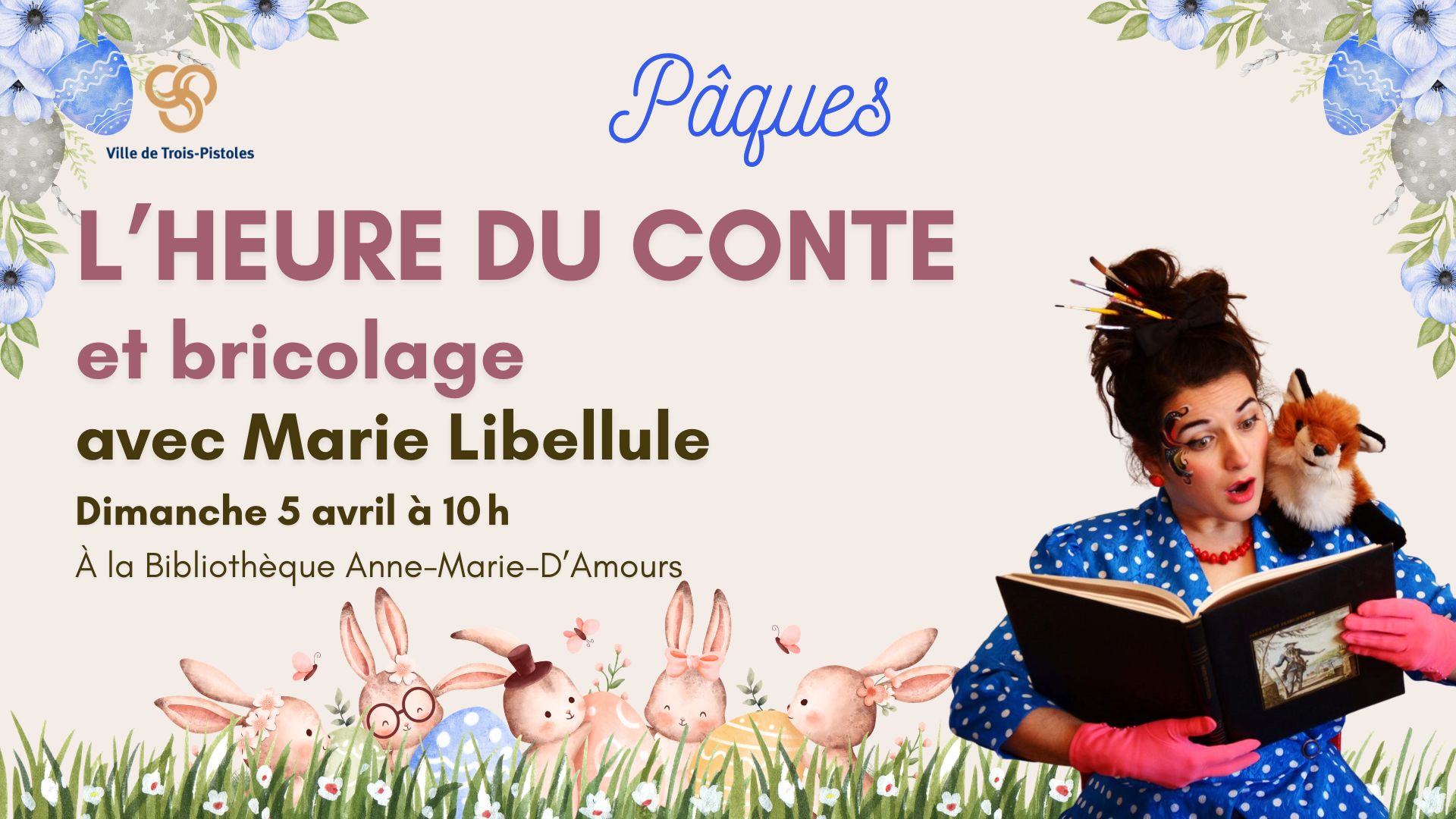 Viens écouter une histoire de Pâques et bricoler avec la fabuleuse Marie-Libellule ! C'est gratuit ! Sans inscription