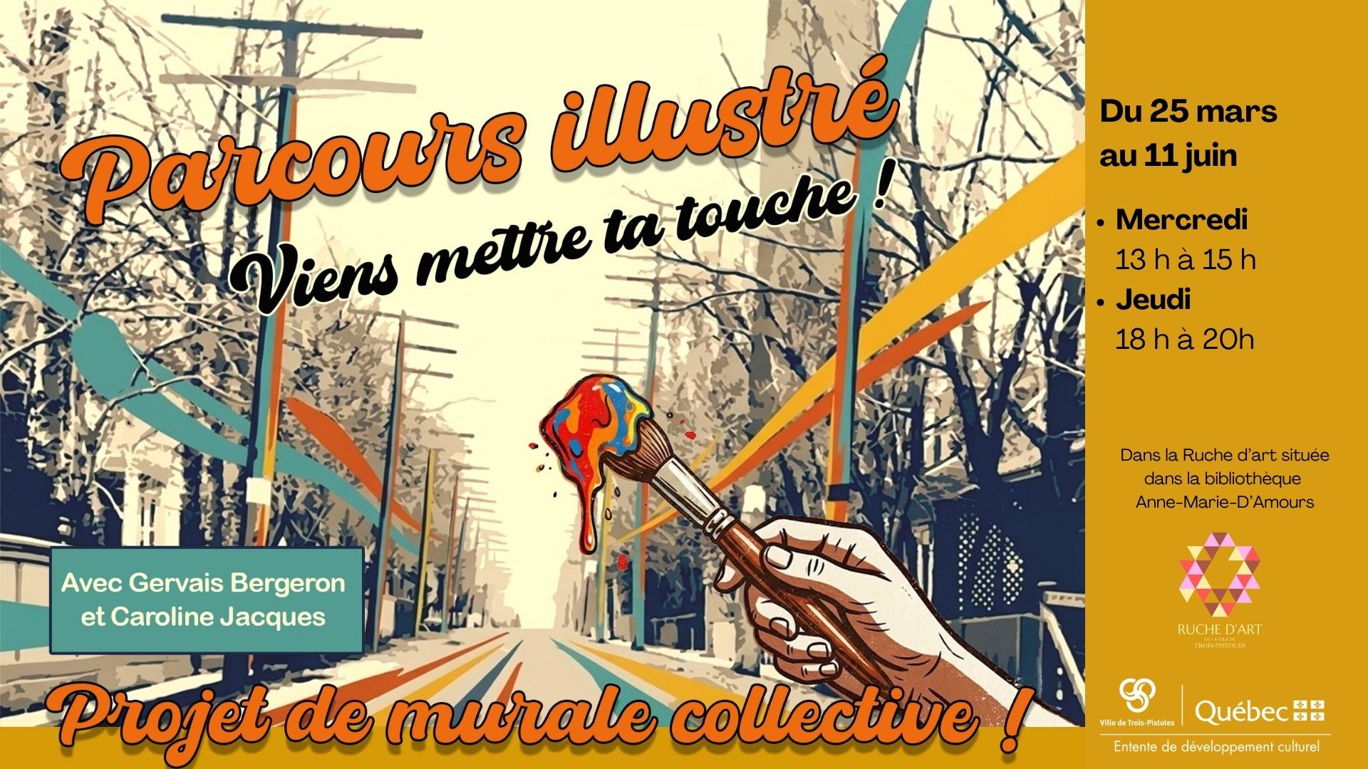 Viens mettre ta touche au parcours illustré de la Ville de Trois-Pistoles ! Pour les personnes de tous âges ! Tous les mercredis et jeudis du 25 mars au 11 juin 2026.
